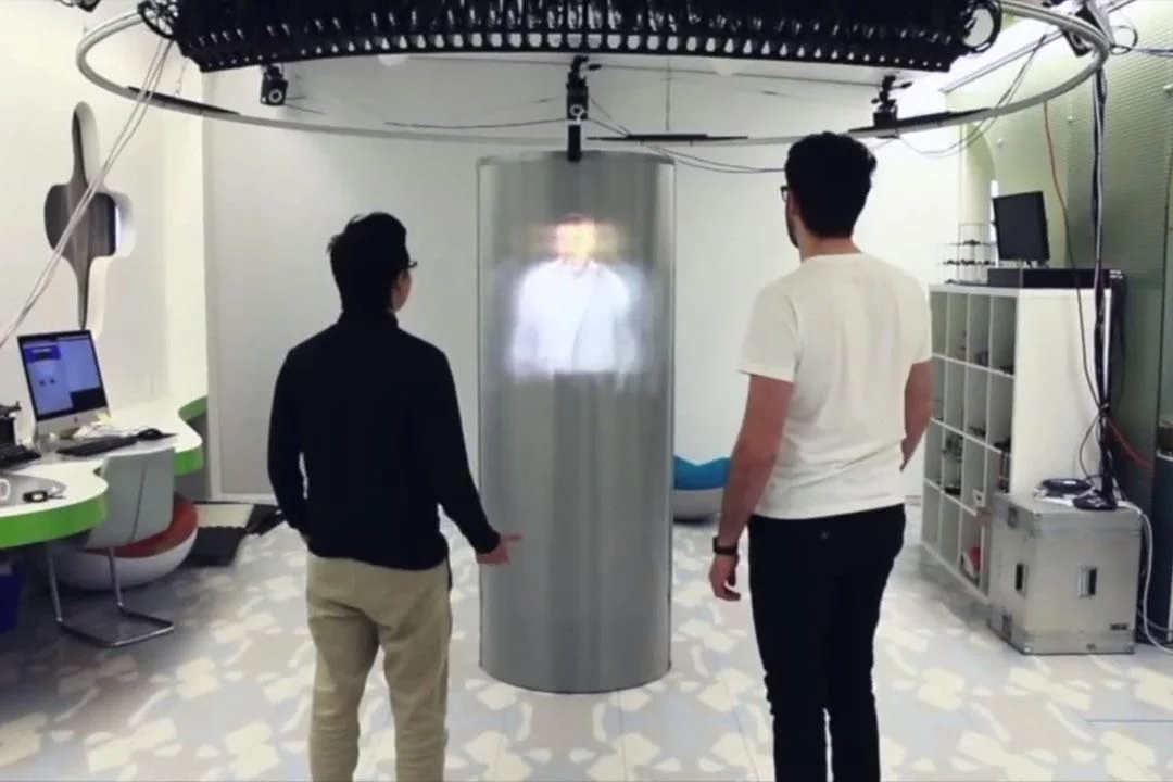 TeleHuman2允許不同地點(diǎn)的人以真人大小的3D形式出現(xiàn)在對(duì)方面前,就好像他們?cè)谕粋€(gè)房間里一樣。通過安裝在真人大小、鏡面反射的圓柱形吊艙上方的智能投影儀,能夠?qū)⑽矬w投射成一個(gè)可以由多個(gè)用戶同時(shí)從不同方向進(jìn)行觀察的光場(chǎng),通過一系列深度攝像機(jī)捕捉到遠(yuǎn)程3D圖像,他們能將一個(gè)人的3D圖像從一個(gè)房間傳送到另一個(gè)房間,這一偉大的技術(shù)將為視頻會(huì)議系統(tǒng)的發(fā)展帶來跨越性的進(jìn)步。