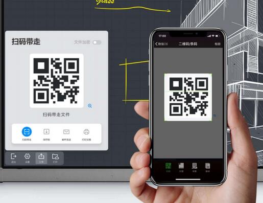 掃碼帶走是MAXHUB會議平板最方便的保存方式,在屏幕左下方點開菜單選項,點擊掃碼帶走的選項。屏幕彈出二維碼,參會人員用微信掃碼,即可帶走所有開會記錄內容。若重要文件,還可以進行加密。