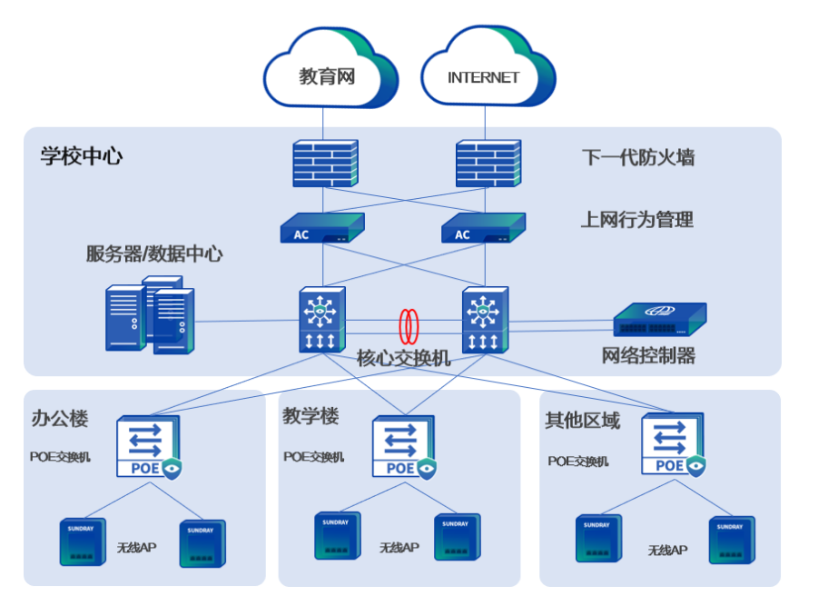 根據學校實際需求,炫億時代針對性地設計全覆蓋、零漫游、易運維的無線網絡解決方案,滿足校園無線網絡的接入安全、統一管理等需求,提升用網體驗、降低運維成本等方面,為教育用戶提供更加優質的服務。