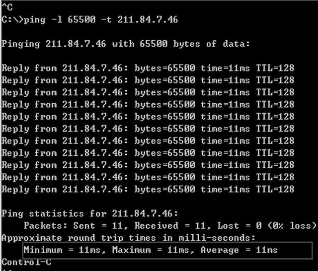 例如:ping -l 65500 -t 211.84.7.46