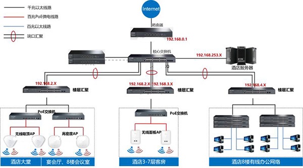 網絡拓撲圖最能直觀的展示一個網絡結構,它能展示網絡的核心設備、線路連接結構、子網劃分等信息。例如為某酒店設計的網絡拓撲圖