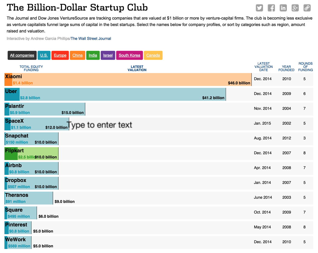 在硅谷大家非常熱情的談創業談機會,我也通過自己的一些觀察和積累,看到了不少最近幾年涌現的熱門創業公司。我給大家一個列表,這個是華爾街網站的全世界創業公司融資規模評選。它本來的標題是 billion startup club,我在去年國內講座也分享過,不到一年的時間,截至到 2015 年 1 月 17 日,現在的排名和規模已經發生了很大的變化。