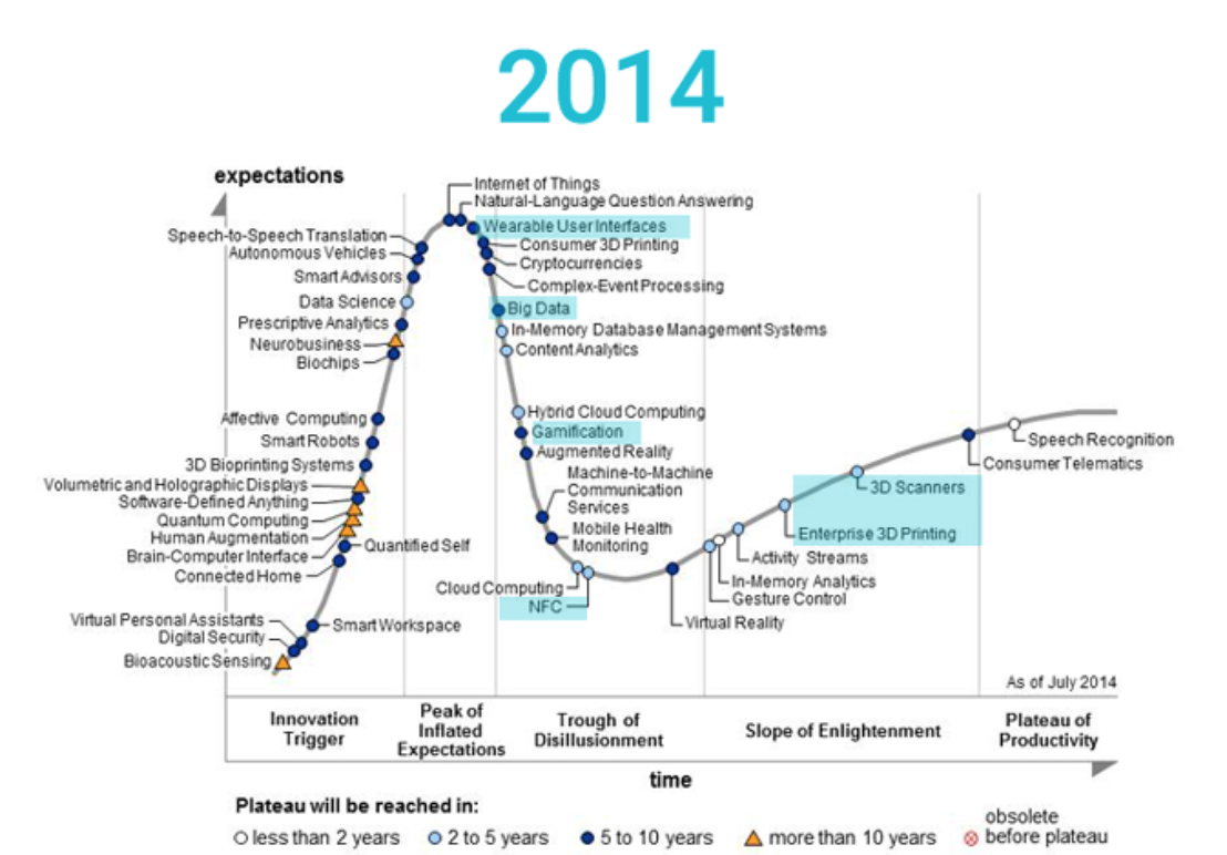 Gartner 公司每年發布技術趨勢炒作圖。今年和去年的圖對比顯示,物聯網、自動駕駛汽車、消費級 3D 打印、自然語言問答等概念正在處于炒作的頂峰。而大數據已從頂峰滑落,NFC 和云計算接近谷底。