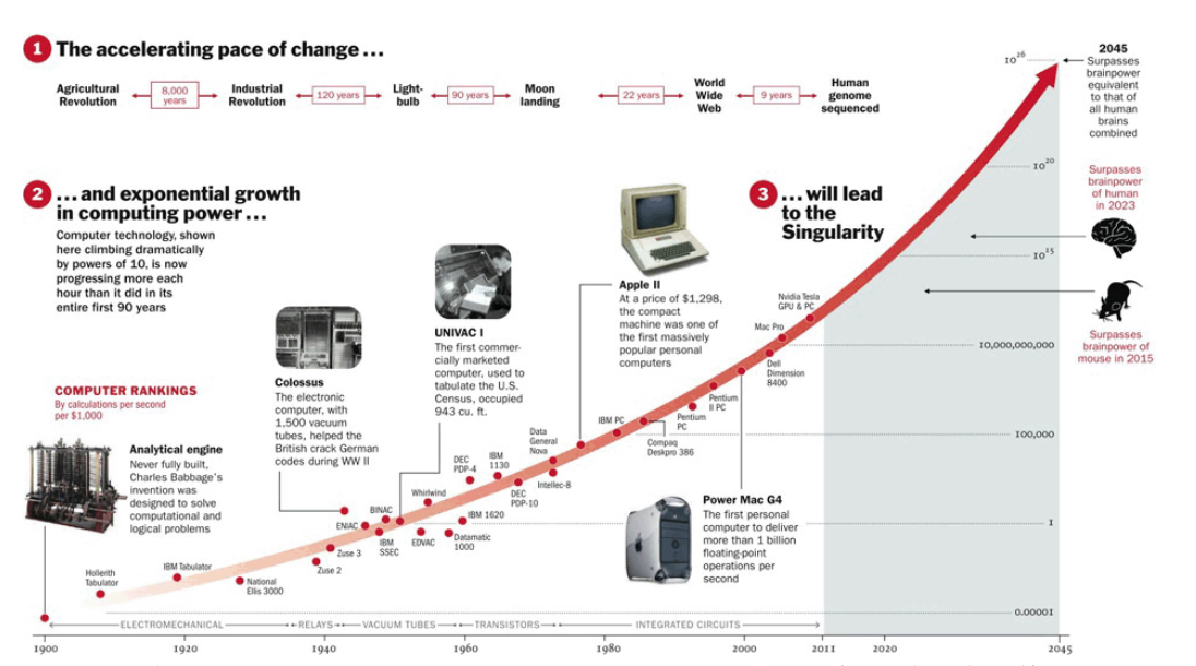 馮諾伊曼是 20 世紀最重要的數學家之一,在現代計算機、博弈論和核武器等諸多領域內有杰出建樹的最偉大的科學全才之一。他提出(技術)將會逼近人類歷史上的某種本質的奇點,在那之后全部人類行為都不可能以我們熟悉的面貌繼續存在。這就是著名的奇點理論。目前會越來越快指數性增長,美國未來學家 Ray Kurzweil 稱人類能夠在 2045 年實現數字化永生,他自己也創辦奇點大學,相信隨著信息技術、無線網、生物、物理等領域的指數級增長,將在 2029 年實現人工智能,人的壽命也將會在未來 15 年得到大幅延長。