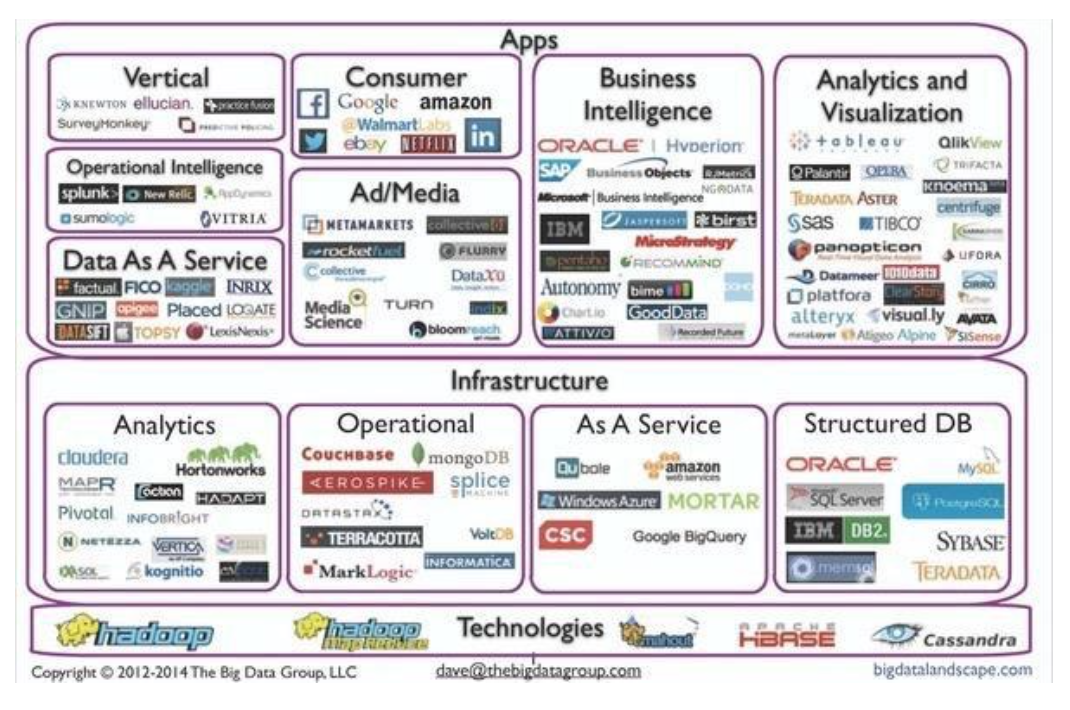 這是 2014 年總結的 Big Data 公司列表,我們大致可以分成基礎架構和應用,而底層都是會用到一些通用技術,如 Hadoop,Mahout,HBase,Cassandra,我在下面也會涵蓋。我可以舉幾個例子,在分析這一塊,cloudera,hortonworks,mapr 作為 Hadoop 的三劍客,一些運維領域,mangodb,couchbase 都是 nosql 的代表,作為服務領域 AWS 和 Google BigQuery 劍拔弩張,在傳統數據庫,Oracle 收購了 MySQL,DB2 老牌銀行專用,Teradata 做了多年數據倉庫。上面的 Apps 更多,比如社交消費領域 Google, Amazon, Netflix, Twitter, 商業智能:SAP,GoodData,一些在廣告媒體領域:TURN,Rocketfuel,做智能運維 sumologic 等等。去年的新星 Databricks 伴隨著 Spark 的浪潮震撼 Hadoop 的生態系統。