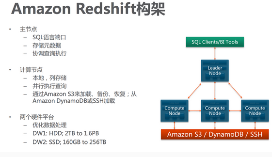 Redshift,它是一種(massively parallel computer)架構,是非常方便的數據倉庫解決方案,就是 SQL 接口,跟各個云服務無縫連接,最大特點就是快,在 TB 到 PB 級別非常好的性能,我在工作中也是直接使用,它還支持不同的硬件平臺,如果想速度更快,可以使用 SSD 的,當然支持容量就小些。