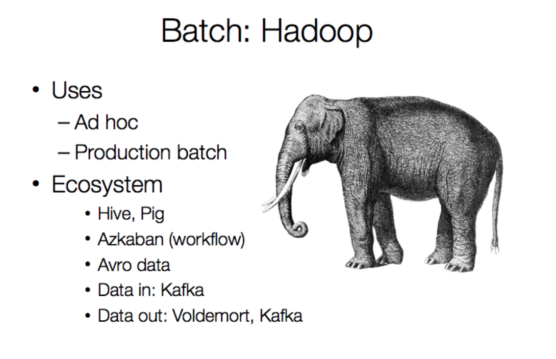 在 Linkedin,Hadoop 作為批處理的主力,大量應用在各個產品線上,比如廣告組。我們一方面需要去做一些靈活的查詢分析廣告主的匹配,廣告預測和實際效果,另外在報表生成方面也是 Hadoop 作為支持。如果你想去面試 Linkedin 后端組,我建議大家去把 Hive, Pig, Azkaban (數據流的管理軟件),Avro 數據定義格式,Kafka,Voldemort 都去看一些設計理念,Linkedin 有專門的開源社區,也是 build 自己的技術品牌。