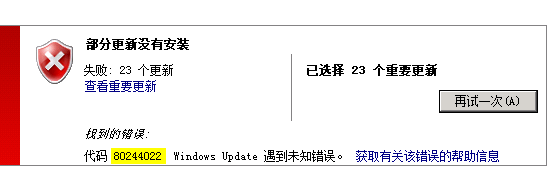 云運維補丁升級解決方案:用戶在需要安裝Windows Update情況下,經(jīng)常會遇到Windows Update失敗的情況,有各種類型的錯誤碼出現(xiàn), 下圖是常見的Windows Update 失敗的報錯, 提示的Error Code為80244022. 該錯誤代碼80244022是微軟內(nèi)部錯誤code,錯誤原因是“HTTP status 503 - the service is temporarily”.